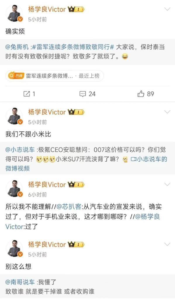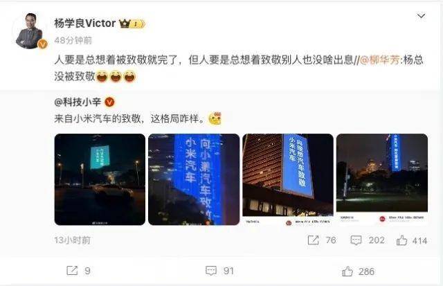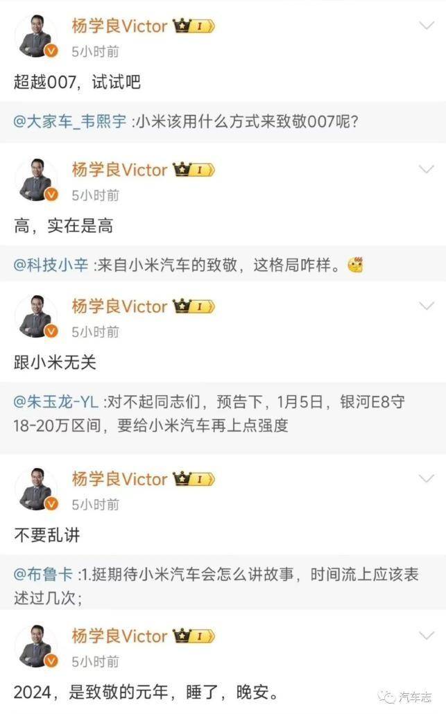 對此,吉利汽車副總裁楊學成發文嘲諷雷軍:“人要是總想著被致敬就完了,但人要是總想著致敬別人也沒啥出息”。