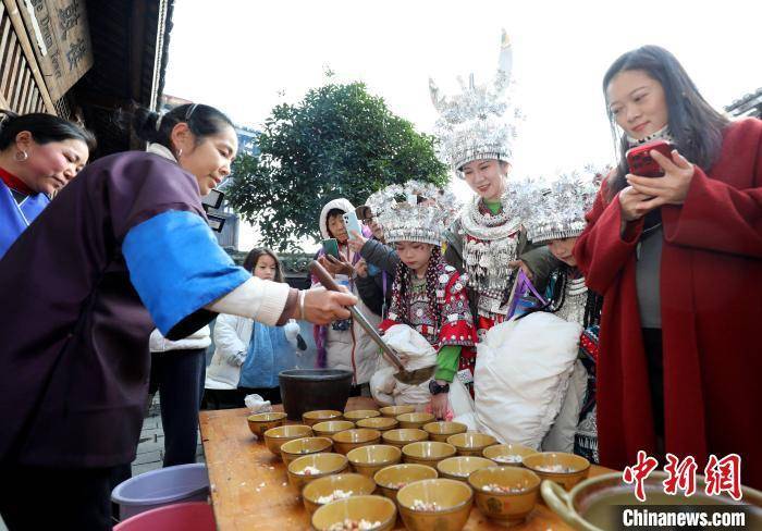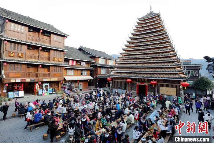 2月9日,中國農歷除夕,廣西三江侗族自治縣林溪鎮程陽八寨景區舉行豐富多彩的文旅活動,以攔路迎賓、侗族打油茶、侗族紡紗表演、侗族百家宴等豐富節目,讓各地游客盡情品味“侗”味十足的“年夜飯”。