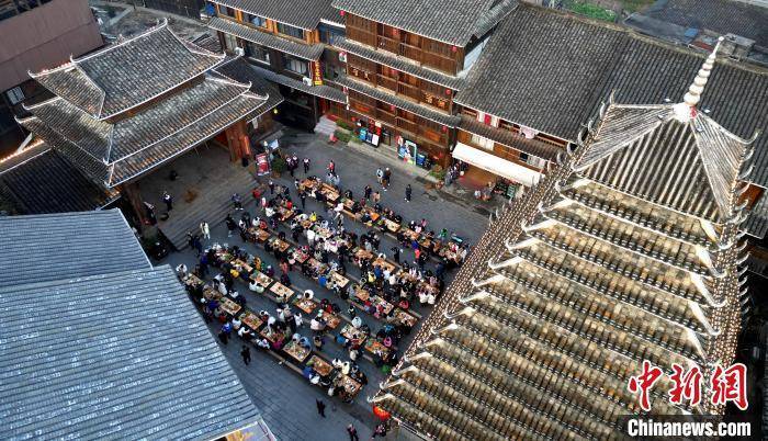 圖為航拍侗族百家宴。引客游客龔普康 攝