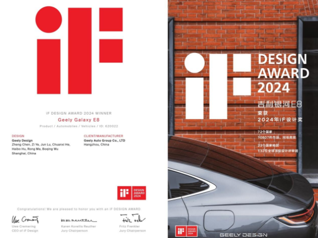 首先,吉利汽車憑借旗下電動車銀河E8“在文化、科技和用戶需求的完美融合”,獲得的2024年iF設計獎。銀河E8是基于SEA浩瀚架構打造的一臺純電動旗艦轎車,光之漣漪的設計語言,可以呈現迎賓歡送、左右流水、跳躍流水、音樂秀的效果,銀河E8的獲獎可謂是實至名歸。