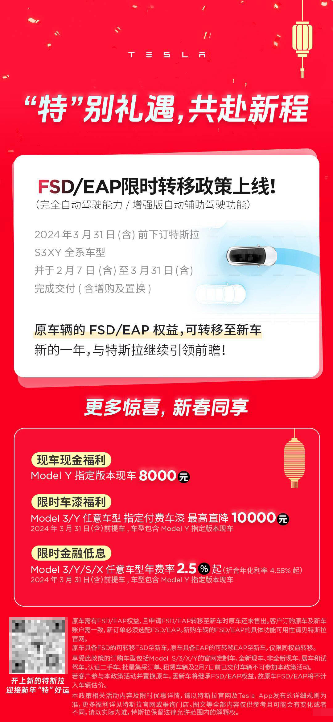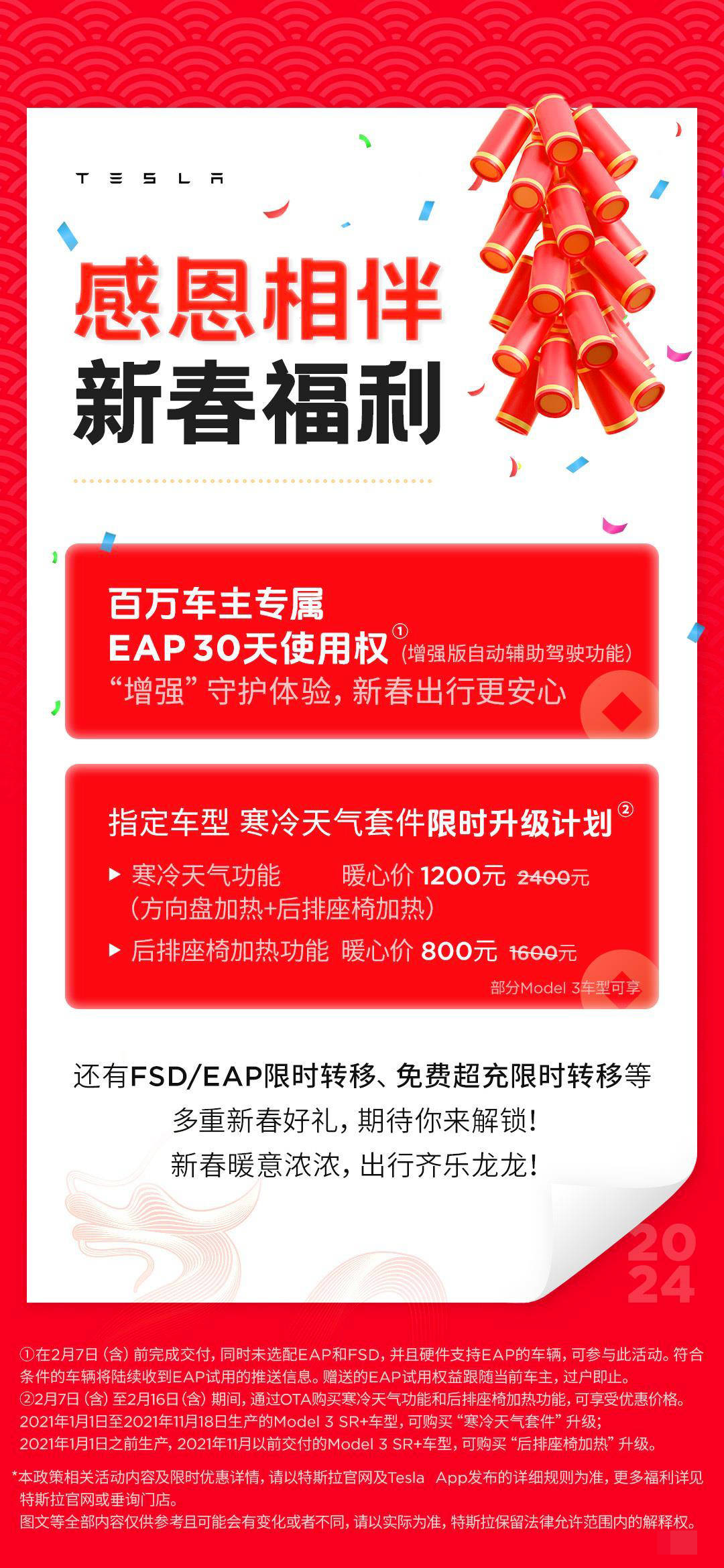 日前,包含布新我們從相關渠道獲悉,多項特斯拉官方宣布推出新春專屬福利,權益AG旗艦廳包含FSD/EAP/免費超充限時轉移、拉發利百萬車主專屬EAP 30天使用權、春福寒冷天氣套件限時優惠升級等等。包含布新