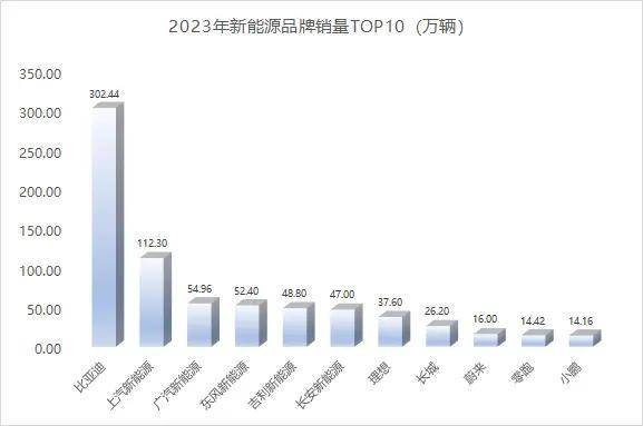 2023年,比亞迪以302.44萬輛坐穩(wěn)榜一位置,與第二名的上汽新能源甩開了190萬輛的差距,隨后是幾家傳統(tǒng)車企的新能源品牌,均徘徊在50萬量級左右的位置,分別是廣汽新能源、東風新能源、吉利新能源以及長安新能源。