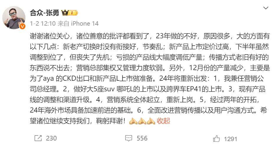 2024年剛開年,哪吒汽車CEO張勇在微博公開檢討“2023年做的不好”,主動提出短板并提出了諸多改進舉措,不難看出哪吒汽車在2024年“重新起飛”的決心。
